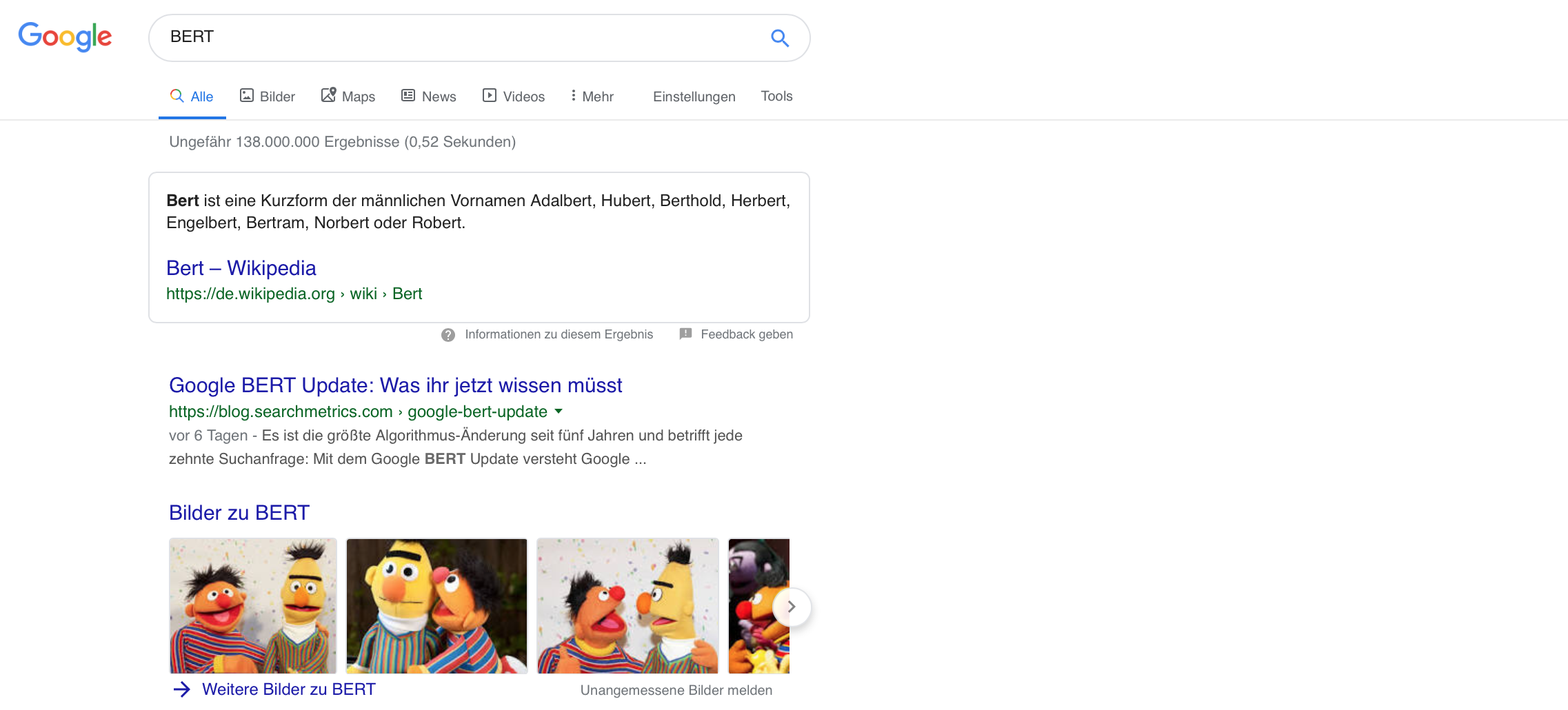 Die launige Abkürzung "BERT" steht für "Bidirectional Encoder Representations from Transformers”. Man hat mit BERT versucht, ein Algorithmus-Modell zu entwickeln, welches mit dem sogenannten Natural Language Processing (NLP), einem Modell neuronaler Netzwerke, die Komplexität menschlicher Sprache nachvollziehen soll, um so die Ergebnisse von Suchanfragen noch stärker an echte zwischenmenschliche Kommunikation anzugleichen. Die Wörter der Suchanfrage sollen stärker in ihrer Beziehung zueinander interpretiert werden, das Ergebnis soll diesen Beziehung besser entsprechen.